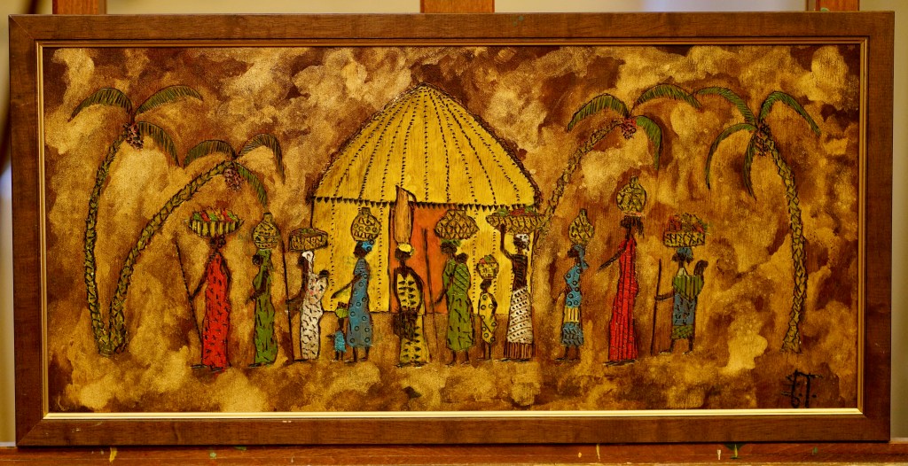 Ses missions avec l’UNESCO en Afrique lui ouvrirent des horizons nouveaux et la découverte de silhouettes typées lui fit reprendre ses pinceaux…femmes africaines sur tous les angles, villages, huttes, batik africain… tout cela devint une importante production artistique.